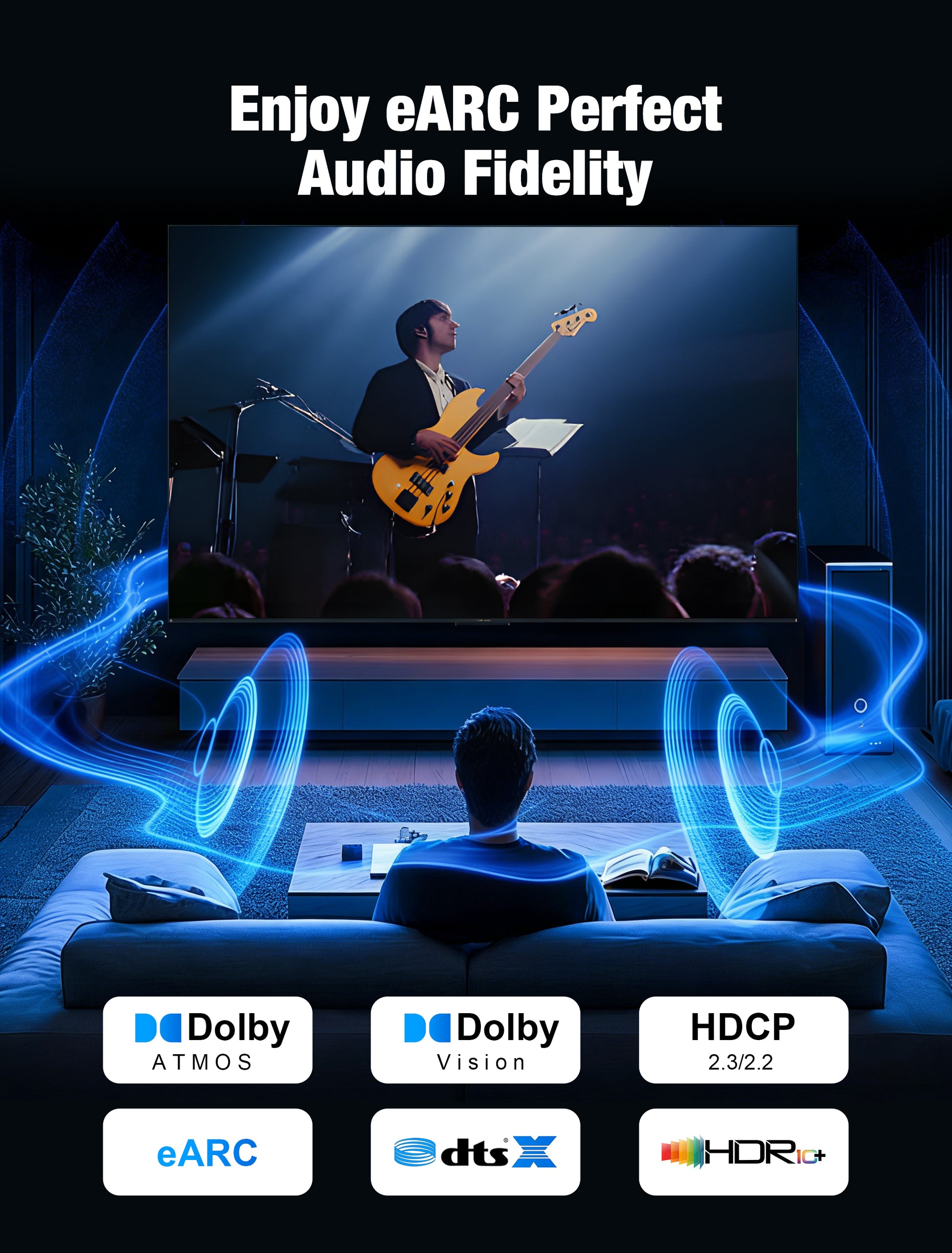 • Premium Audio with eARC Support – Enhanced Audio Return Channel delivers lossless Dolby Atmos, DTS:X, and multi-dimensional surround sound. Experience cinema-quality audio with deep bass and crystal-clear dialogue for true home theater immersion.