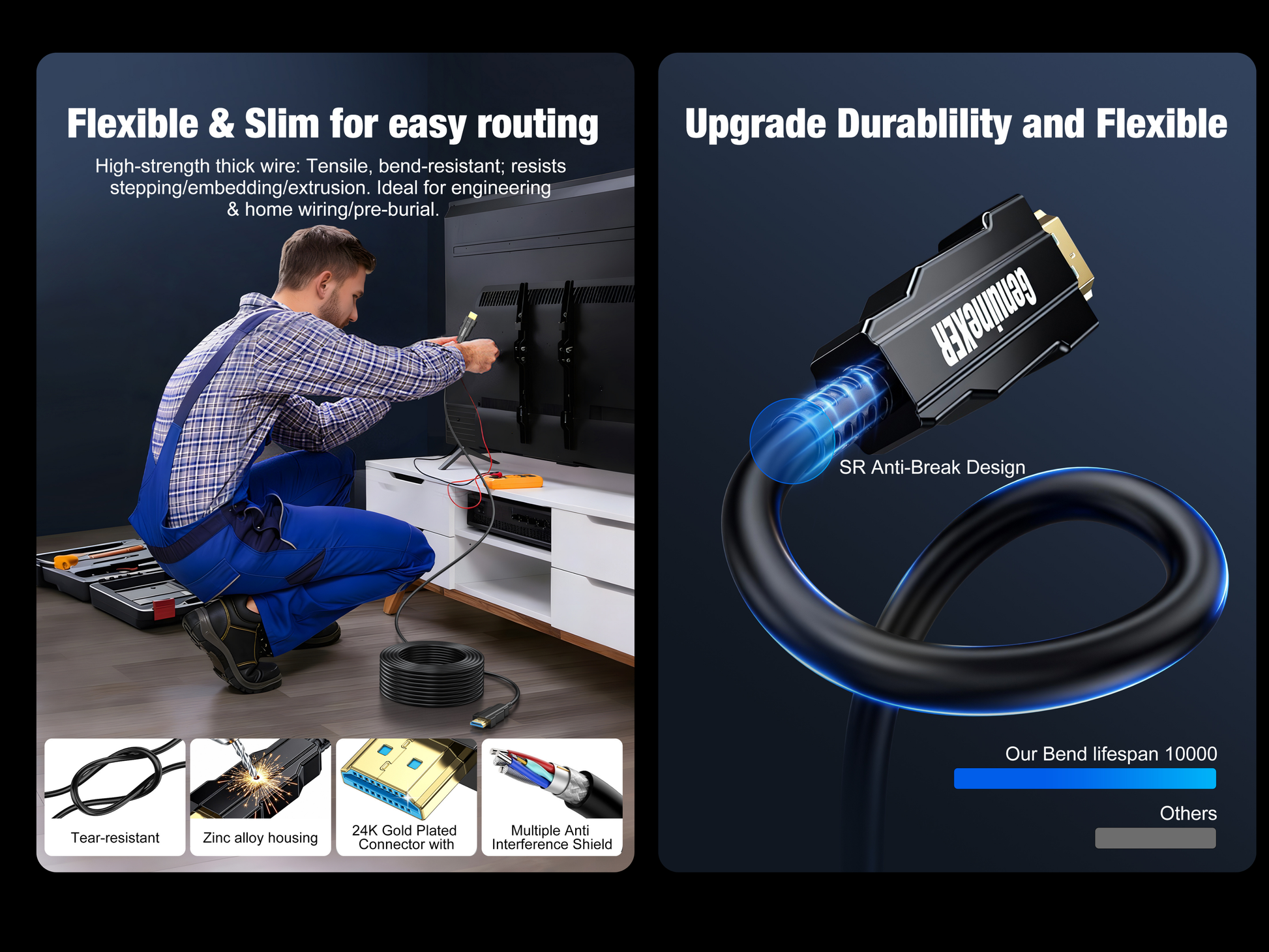 • Ultra-Durable Build with 10,000+ Bend Rating – Tear-resistant construction with multiple EMI/RFI shielding layers, zinc alloy housing, gold-plated connectors, and SR Anti-Break strain relief. HDCP 2.3/2.2 compatible with all devices.